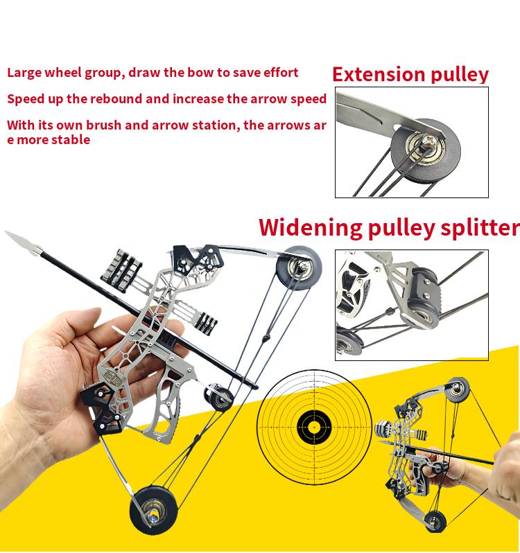 This bow features a dual-wheel pulley system that maximizes draw efficiency and arrow speed. Combined with an integrated arrow rest and stabilizing brush, it ensures every shot is accurate and consistent, perfect for serious archers wanting to improve their performance.
